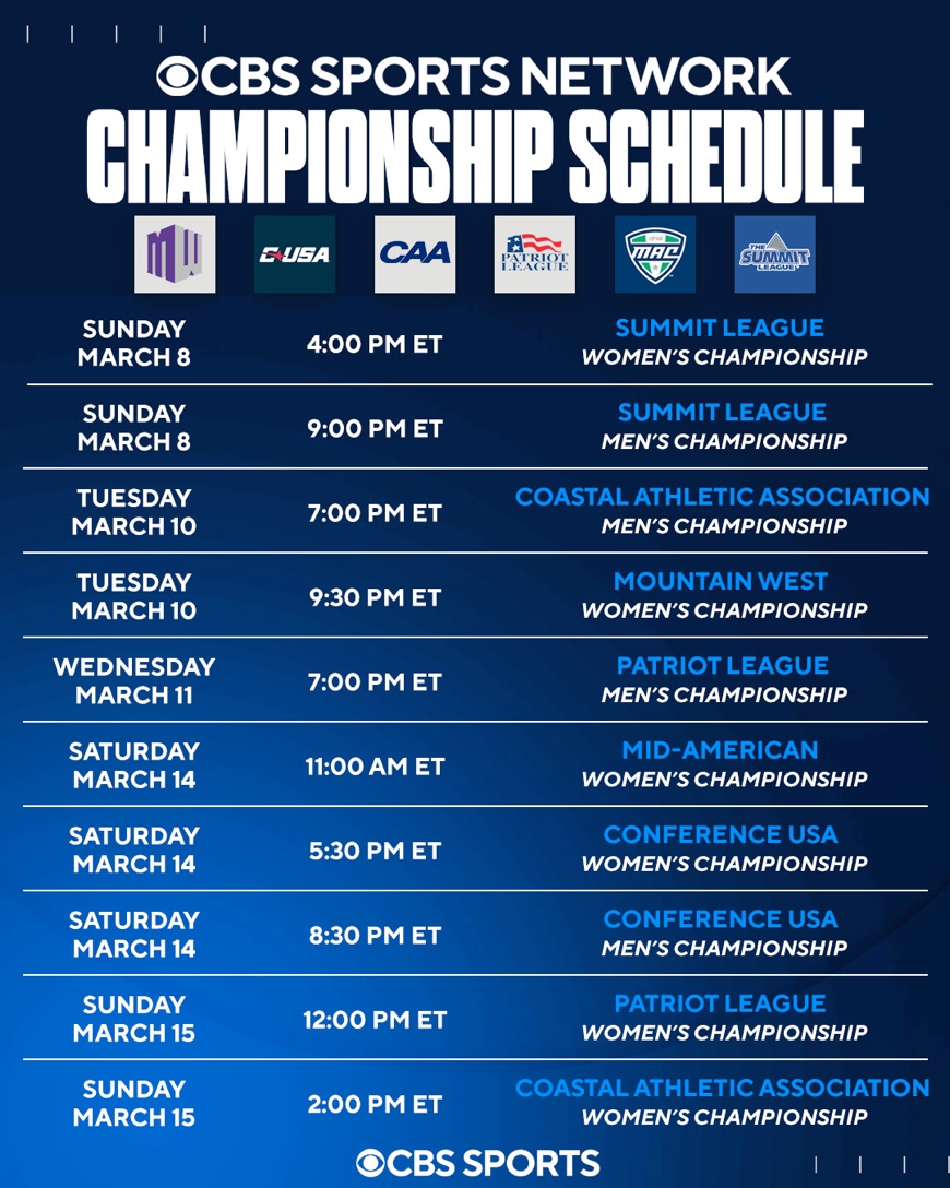 Ten automatic bids to the Men’s and Women’s NCAA Tournaments will be awarded on CBS Sports Network beginning on Sunday, March 8.
