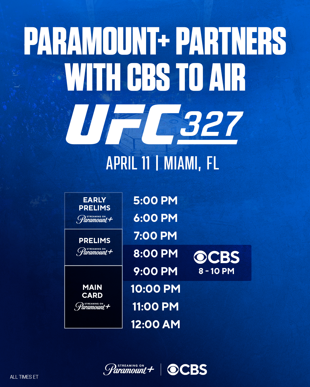 • The UFC 327 main card will start at 9:00 PM ET, with CBS simulcasting the first hour of the main card live from 9:00-10:00 PM ET/6:00-7:00 PM PT, while the remainder of the evening’s bouts will be available exclusively on Paramount+.
